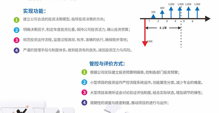 系統特色:規范投資管理的模型執行落實,實現與財務收益的一體化,嚴控投資的方向與效益,實現投資盈利。